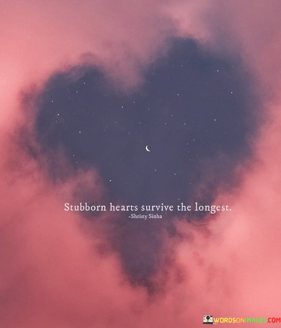 In essence, "Stubborn hearts survive the longest" emphasizes the importance of perseverance and tenacity in navigating life's ups and downs. When faced with obstacles or setbacks, individuals with stubborn hearts are less likely to be discouraged and more likely to persist in their pursuit of their goals, dreams, or values.