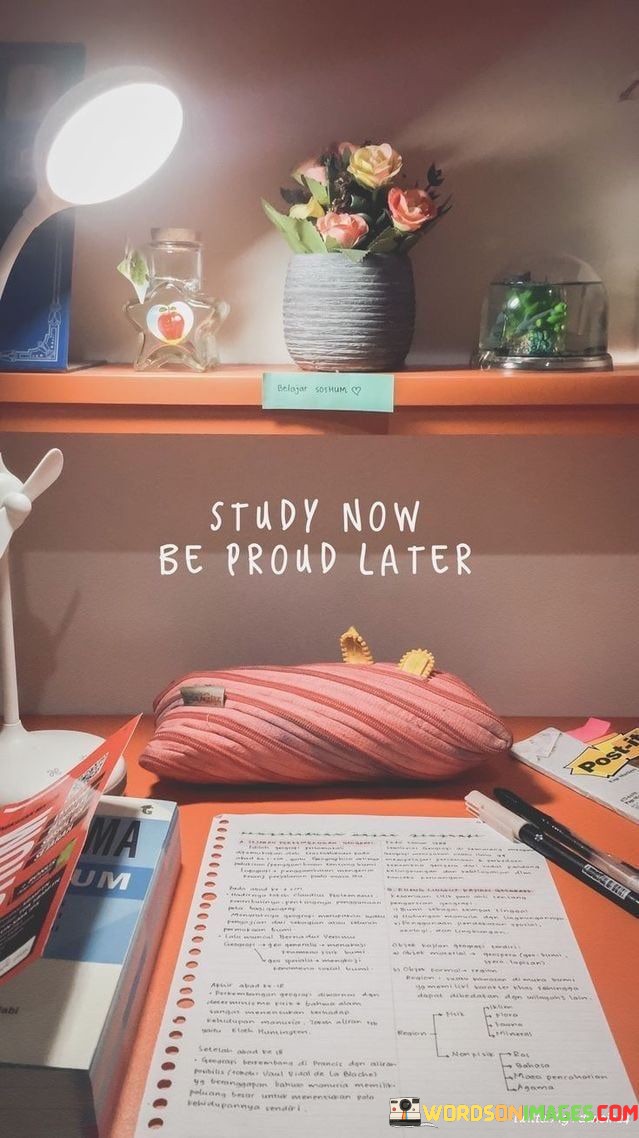 In essence, "Study Now Be Proud Later" is a motivational reminder that the path to success often involves dedication to learning and personal development in the present, which will ultimately lead to a brighter and more fulfilling future.