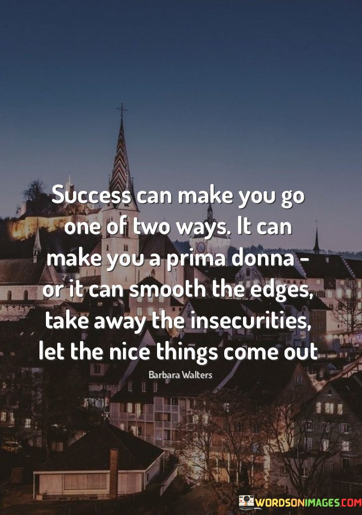 The quote highlights the contrasting impacts of success. It can either inflate one's ego, turning them into a self-centered "prima donna," or it can humble them, refining their character by removing insecurities and revealing their positive traits.