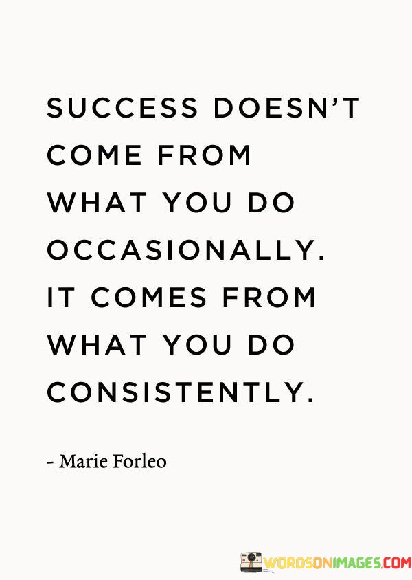 "Success Doesn't Come From What You Do Occasionally, It Comes From What You Do Consistently": This statement underscores the importance of consistency in achieving success. It highlights that sporadic efforts are insufficient; rather, it's the sustained and disciplined actions over time that lead to meaningful accomplishments.