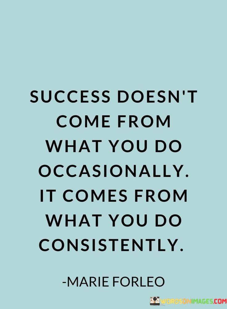 The phrase "Success doesn't come from what you do occasionally" highlights that infrequent or irregular actions are unlikely to lead to significant success. It implies that genuine success requires ongoing and unwavering dedication.