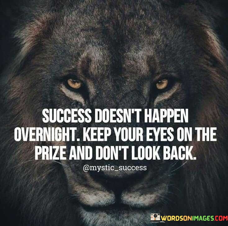 The statement "Success doesn't happen overnight. Keep your eyes on the prize and don't look back" succinctly conveys the idea that meaningful achievements require patience and focused determination. In this context, the first paragraph emphasizes that genuine success is a gradual process.