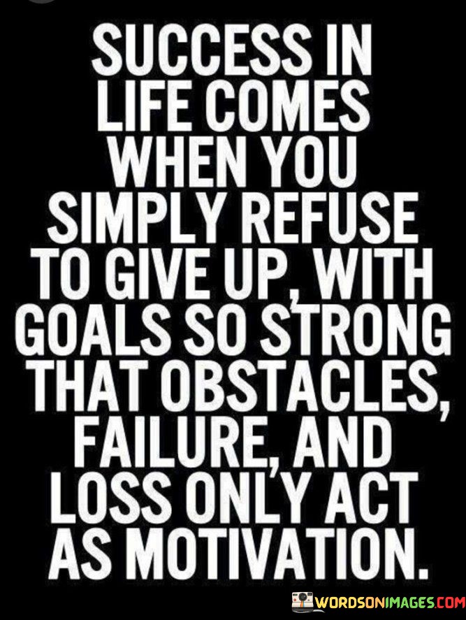 The statement suggests that a key factor in achieving success is the refusal to give up, even in the face of challenges, failures, or setbacks. It emphasizes the power of having strong, compelling goals that serve as a driving force to overcome obstacles and setbacks.