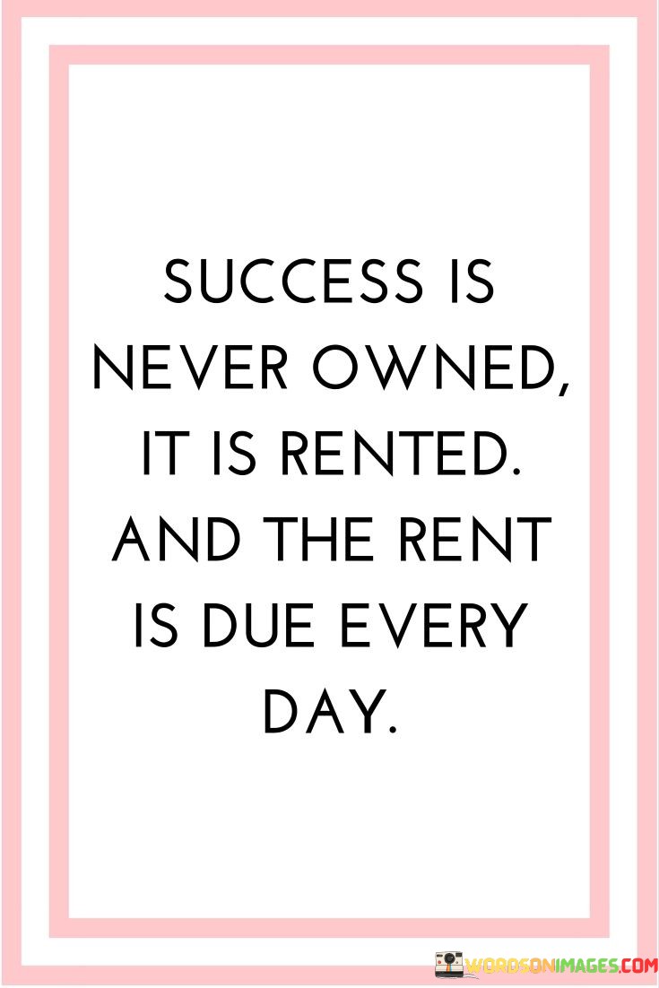 The statement "Success Is Never Owned, It Is Rented, And The Rent Is Due Every Day" poignantly conveys the notion that achieving and maintaining success requires ongoing dedication and effort. It suggests that success is not a permanent possession but rather a continual commitment.
