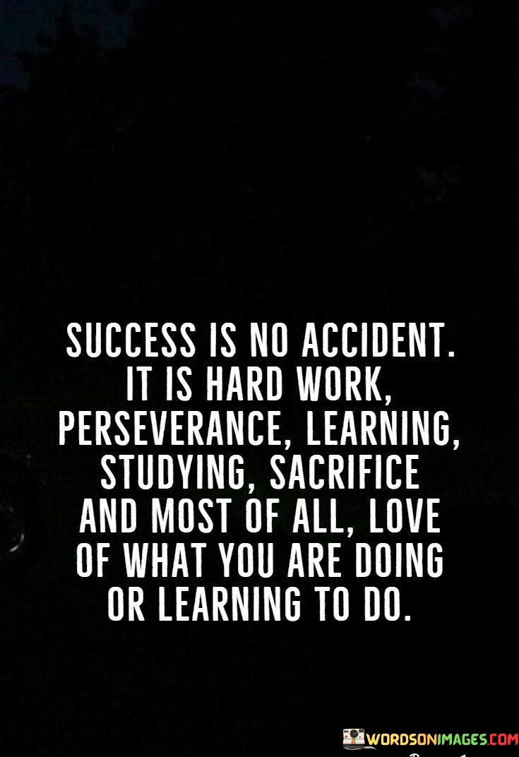 "Success Is No Accident. It Is Hard Work, Perseverance, Learning, Studying, Sacrifice, and Most of All, Love of What You Are Doing or Learning to Do." This quote succinctly outlines the ingredients that compose success. It asserts that achievements are the outcomes of deliberate efforts and dedication, underpinned by a genuine passion for the pursuit.