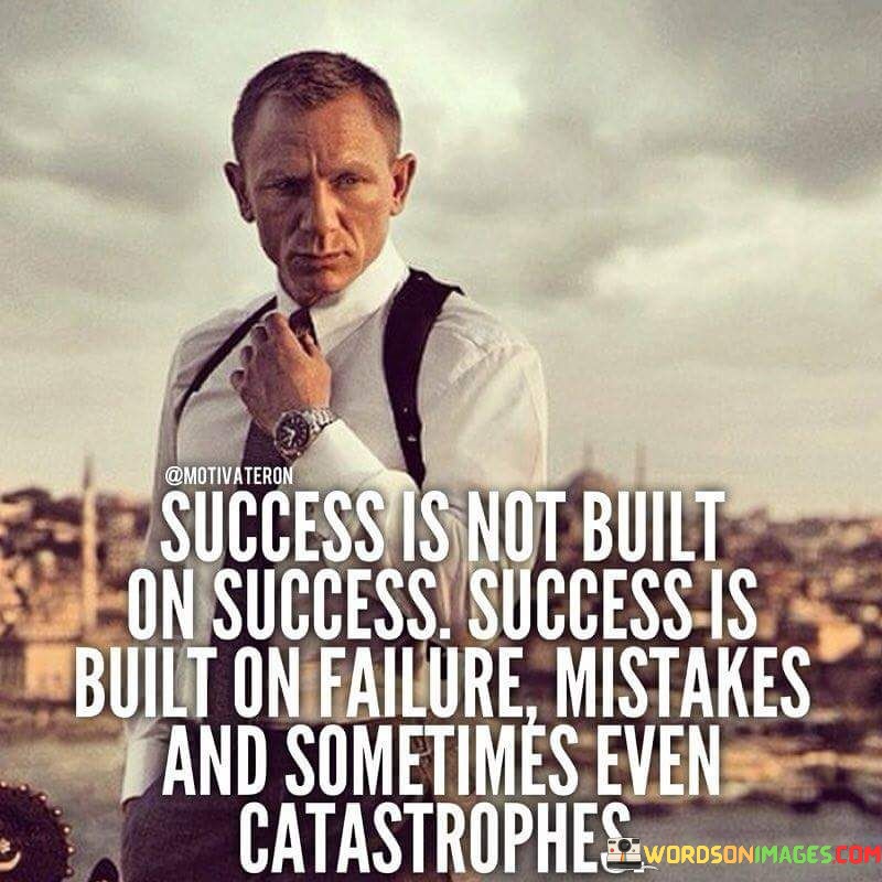 This quote captures a profound insight into the nature of success. In the first part, "Success Is Not Built On Success," it challenges the notion that success is merely a linear progression of achievements. Instead, it suggests that genuine success often involves setbacks, challenges, and failures.