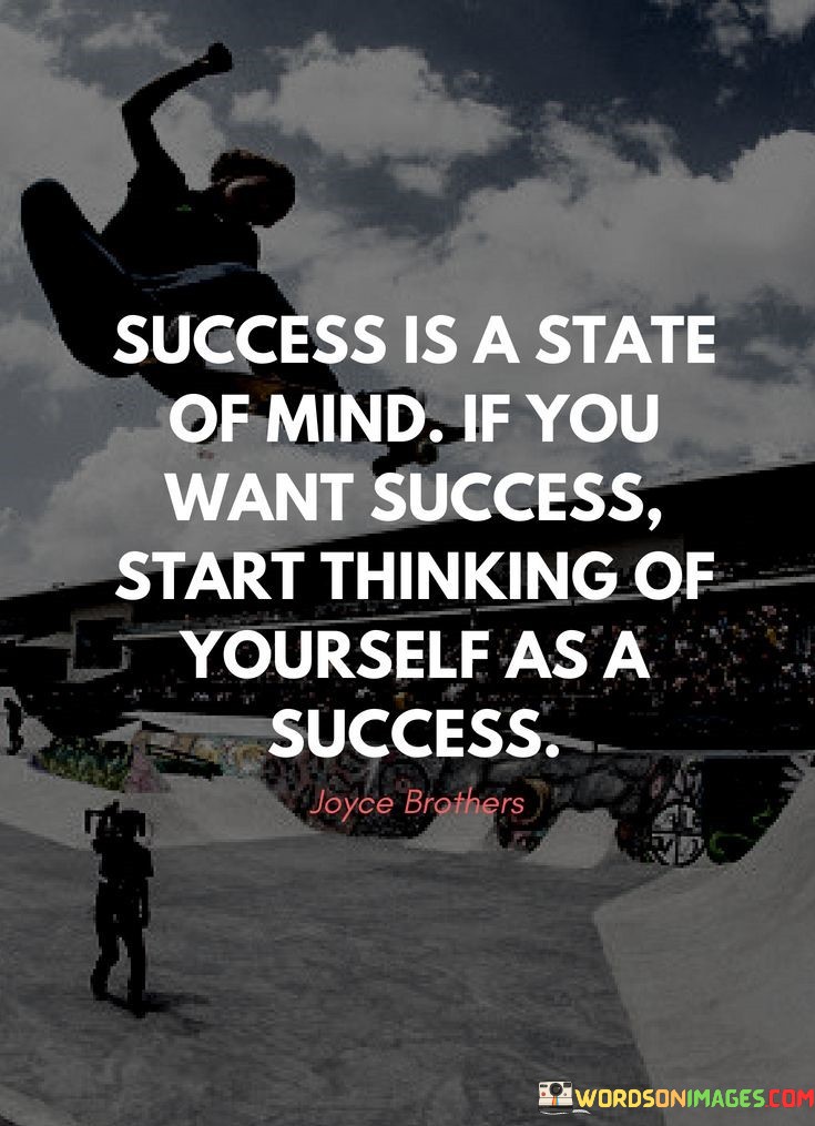 The statement "Success Is the State of Mind: If You Want Success, Start Thinking of Yourself as a Success" underscores the influence of mindset on achieving success and suggests that believing in oneself as successful is a key step towards realizing it.