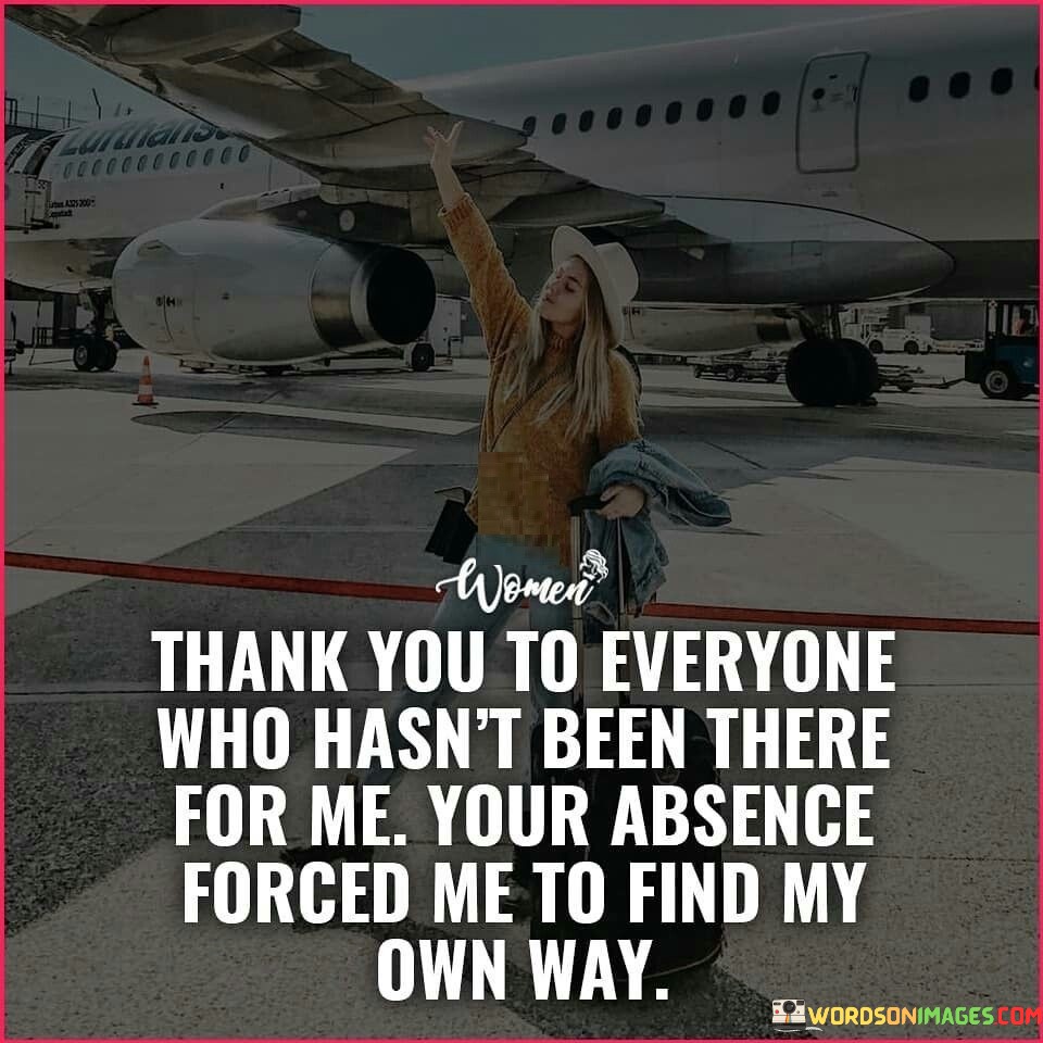 This quote reflects a sentiment of gratitude towards those who have not been present during the speaker's difficult times. Rather than expressing bitterness or disappointment, the speaker acknowledges the significance of their absence. They assert that the absence of support from these individuals compelled them to seek their own path and develop self-reliance. In a way, the quote celebrates the strength and resilience that emerged as a result of facing challenges alone.In a world where support from others is often cherished, this quote reminds us that there can be growth and strength found in overcoming difficulties independently. It speaks to the human capacity to adapt and thrive, even in the face of adversity and the absence of external aid. Ultimately, the quote encapsulates the idea that one can discover their own inner resources and forge a unique path through life by navigating challenges with self-determination and self-reliance.