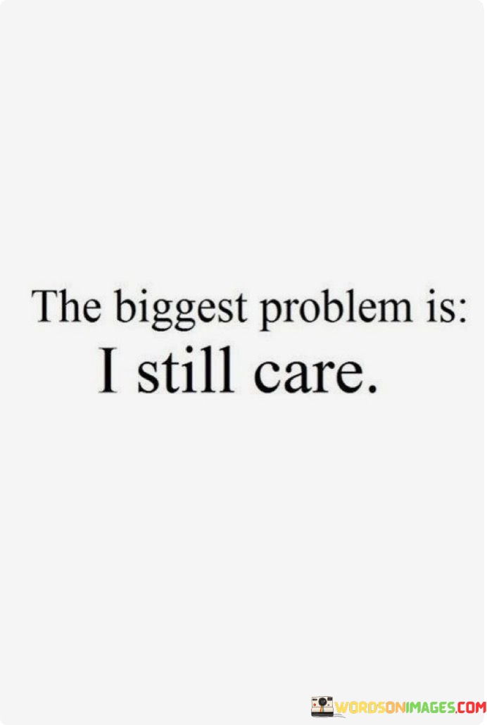 This statement reflects the challenge of moving on from a situation or person that once held great significance. It reveals the internal struggle of caring deeply despite recognizing the need to let go. The phrase acknowledges that sometimes, caring too much can hinder personal growth and healing.