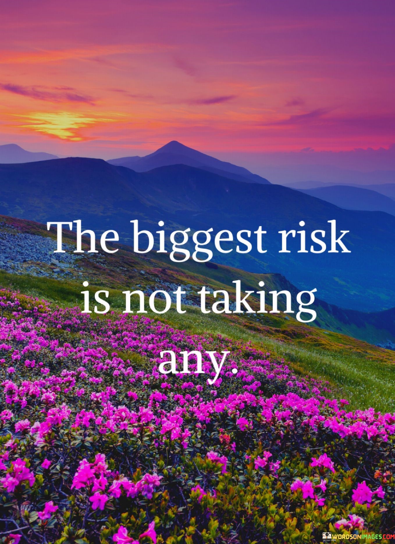 This quote, "The Biggest Risk Is Not Taking Any," emphasizes the idea that in life, avoiding risks altogether can be the riskiest choice of all. In the first place, it suggests that playing it safe and never venturing outside one's comfort zone can lead to missed opportunities and stagnation. Imagine a person who never tries anything new or challenging; they might never discover their true potential or experience personal growth.