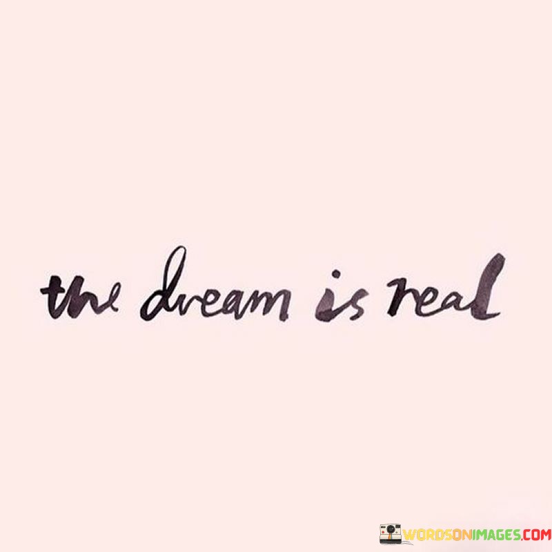 "The Dream Is Real" signifies that our aspirations and desires are attainable and can become a reality with dedication and persistence. It's like a reminder that our dreams are not just fantasies but achievable goals waiting to be pursued.