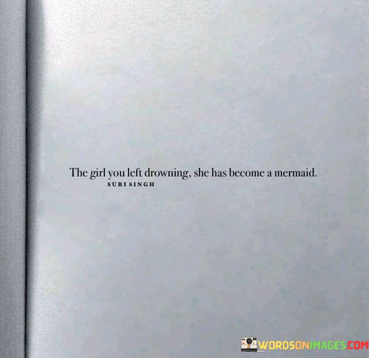 The quote "The girl you left drowning, she has become a mermaid" is a metaphorical expression that conveys a powerful transformation of someone who has faced adversity or challenges. It suggests that the girl who was once struggling and overwhelmed has not only survived but has thrived and transformed into something extraordinary.