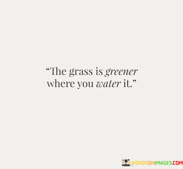 The quote "The grass is greener where you water it" is a metaphorical statement that conveys a valuable life lesson about the importance of nurturing and investing in one's own circumstances and relationships. It suggests that instead of constantly seeking something better elsewhere, we should focus on tending to and improving what we already have.
