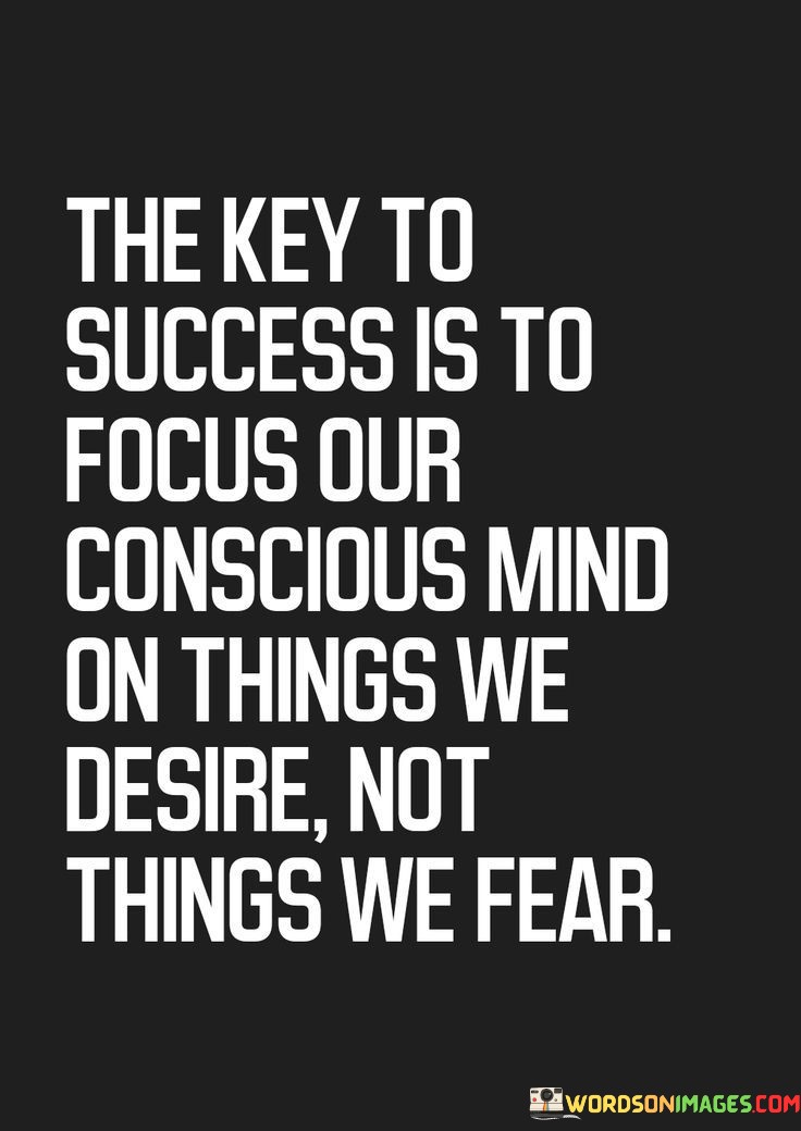 The statement "The Key to Success Is to Focus Our Conscious Mind on Things We Desire, Not Things We Fear" highlights the importance of directing our thoughts towards positive outcomes and aspirations, rather than dwelling on negative possibilities.