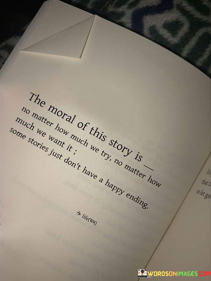 The quote reflects on the realities of life and storytelling. "No matter how much we try" signifies effort and desire. "Some stories just don't have a happy ending" implies the absence of a positive conclusion. The quote conveys the message that not all endeavors result in the desired outcome.