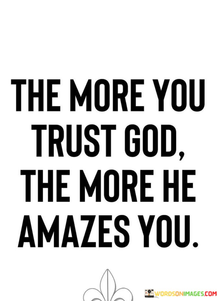 The quote "The More You Trust God, The More He Amazes You" conveys a message of faith and the wonder of divine intervention. It suggests that when individuals place their trust in a higher power or a spiritual belief system, they often experience moments of profound amazement and awe at the unexpected and positive outcomes that unfold.
