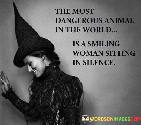 This quote presents a thought-provoking perspective on the power and potential of a woman in a seemingly serene state. It suggests that a smiling woman sitting in silence can be the most formidable and potent force in the world. The quote highlights the capacity of a woman to wield influence and impact without needing to raise her voice or engage in overt displays of strength. The smile symbolizes an aura of positivity, confidence, and inner peace, while the silence represents a calm and composed demeanor. Combined, they create an intriguing juxtaposition that captures attention and commands respect. This quote challenges preconceived notions that power is synonymous with aggression or dominance, emphasizing that true strength lies in subtlety and understated actions. The quote suggests that a woman who exudes warmth and contentment, yet remains quiet and observant, possesses a heightened awareness and a deep understanding of the world around her. It hints at the potential danger she can pose to those who underestimate her or dismiss her abilities. The silence may signify her ability to carefully observe and strategize, biding her time until the optimal moment to assert herself. It implies that her smile, though seemingly harmless, conceals a strength and determination that can be unleashed when necessary. Ultimately, this quote serves as a reminder to not underestimate the power and influence that a woman can wield,