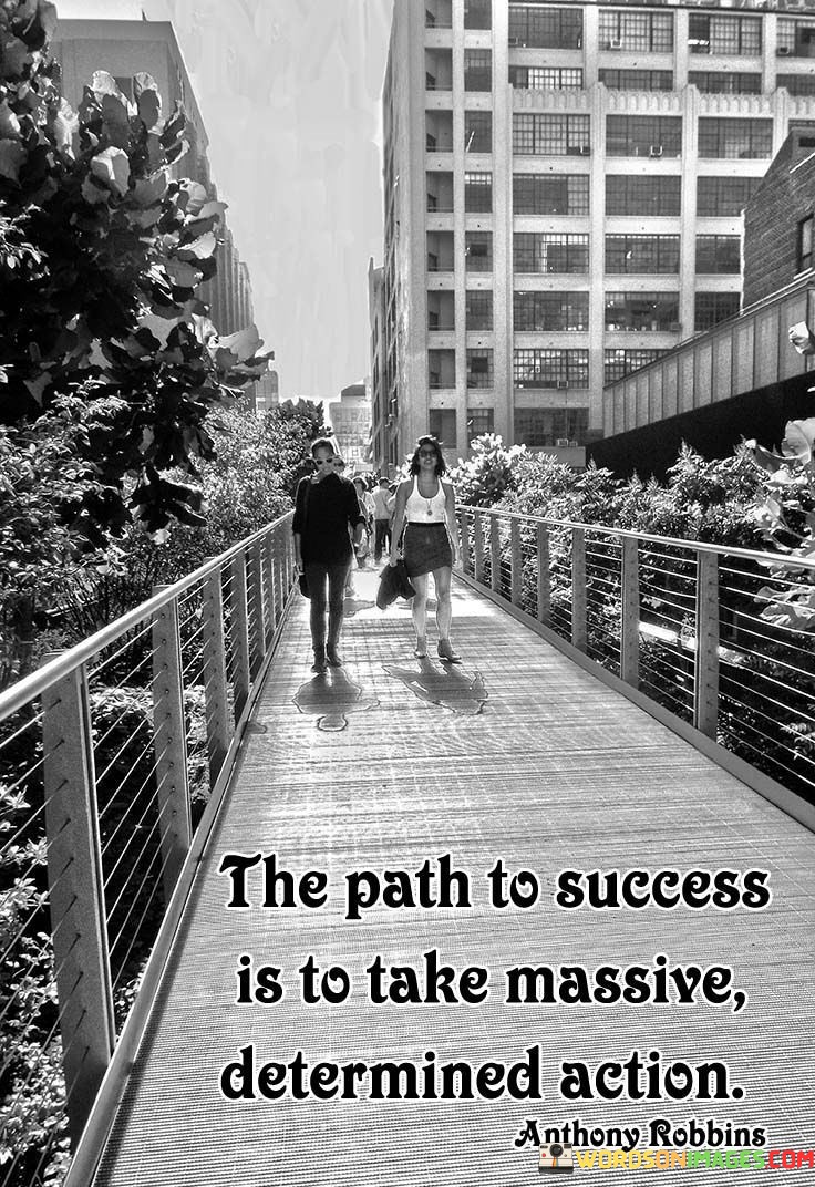The quote "The Path To Success Is To Take Massive Determined Action" conveys the importance of bold and resolute steps in achieving one's goals. It emphasizes that meaningful success requires proactive and persistent efforts.