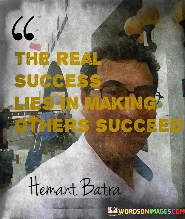 The Real Success Lies In Making Others Succeed" encapsulates the idea that true achievement is found in helping others excel. It suggests that selfless actions contributing to others' success yield a more meaningful and lasting form of personal fulfillment.