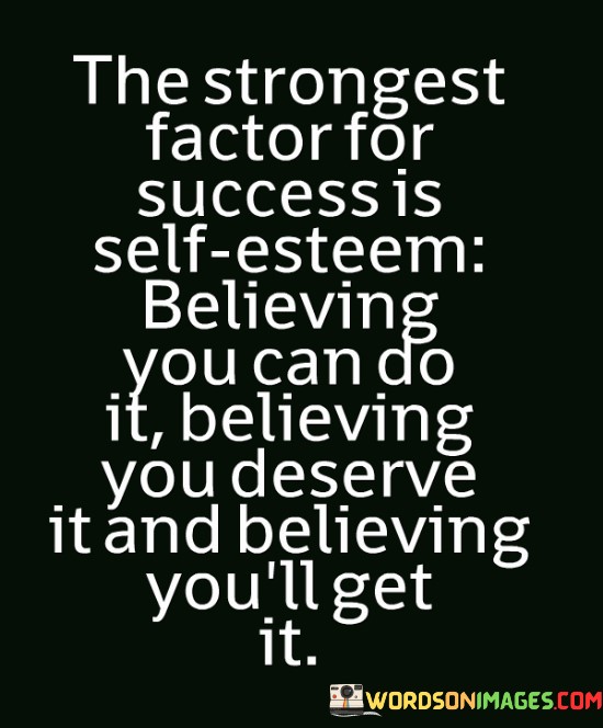The statement "The Strongest Factor for Success Is Self-Esteem: Believing You Can Do It, Believing You Deserve It, and Believing You'll Get It" highlights the critical role that self-confidence and a positive self-image play in achieving success.
