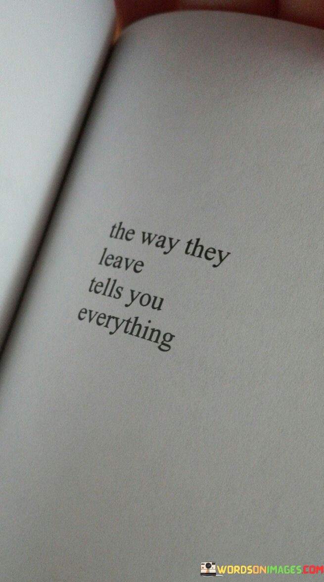 The quote underscores the nonverbal communication of actions. It suggests that actions can provide more honest insights than words alone. "Tells you everything" conveys that observing how someone leaves can provide a deeper understanding of their emotions and motivations.