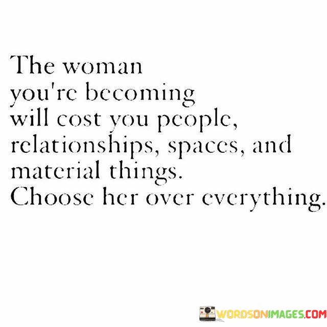 The quote "the woman you're becoming will cost you people, relationships, spaces, and material things; choose her over everything" encapsulates the transformative journey of personal growth and the sacrifices that often accompany it. It emphasizes the importance of prioritizing one's own development, self-discovery, and evolution, even if it means letting go of certain people, relationships, and material attachments that no longer align with the woman one is becoming.The phrase "the woman you're becoming" acknowledges the ongoing process of self-discovery and personal growth. It suggests that as individuals evolve and transform, they may outgrow certain aspects of their lives, including relationships, spaces, and material possessions. This recognition implies that personal growth requires change and the willingness to let go of what no longer serves one's development.The quote highlights that embracing the woman one is becoming may come at a cost. It acknowledges that certain people may not be supportive or accepting of one's growth and evolution. Relationships that were once significant may no longer align with the newfound values, aspirations, or mindset of the individual. The quote also suggests that spaces and material possessions may need to be relinquished as they may no longer resonate with the path of personal growth.Ultimately, the quote celebrates the journey of self-discovery and personal growth. It acknowledges that embracing the woman one is becoming may require sacrifices, but it encourages individuals to prioritize their own development and choose a path that aligns with their true selves. It serves as a reminder to value personal growth, authenticity, and fulfillment above external expectations, relationships, and material possessions.