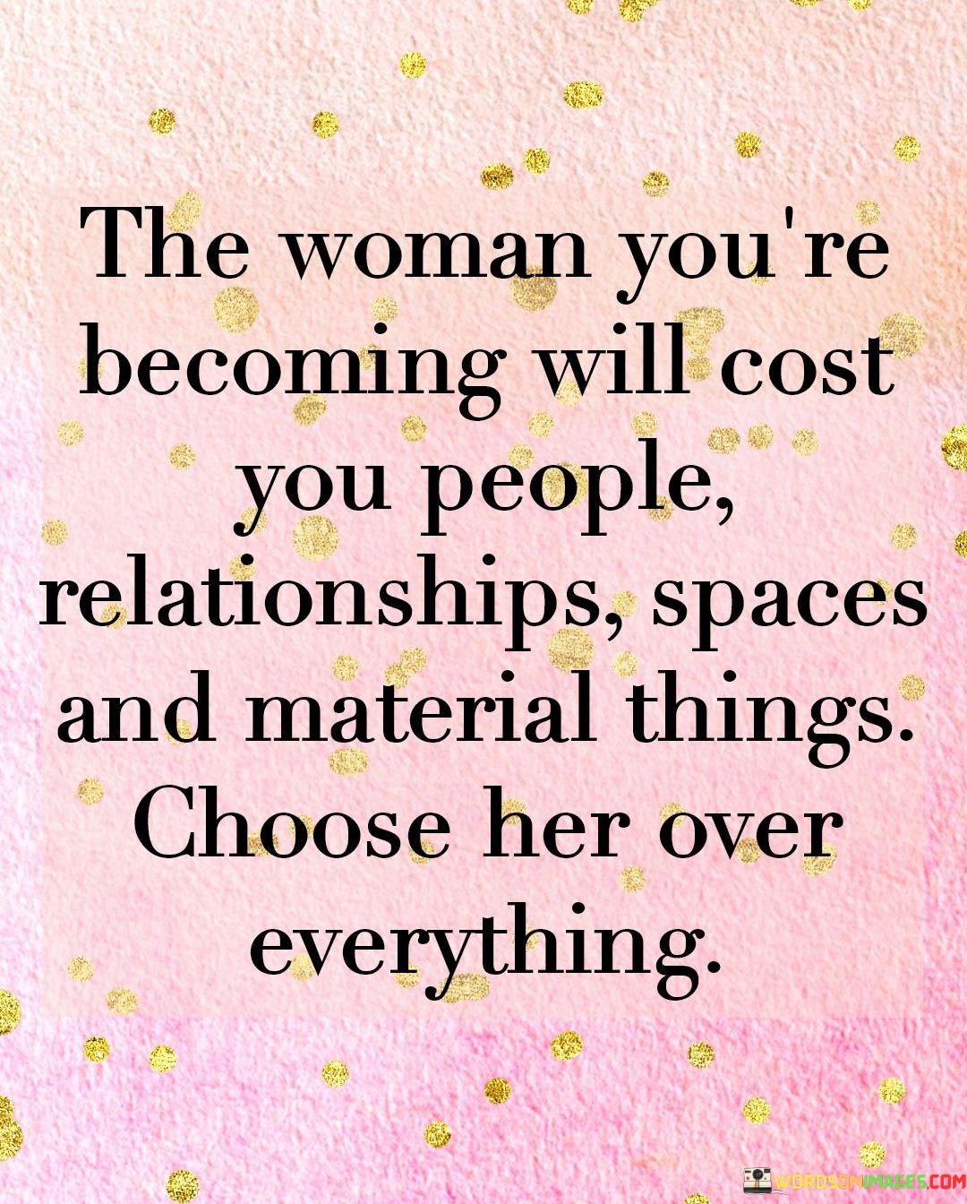 The quote "The woman you're becoming will cost you people, relationships, spaces, and material things. Choose her over everything" emphasizes the transformative nature of personal growth and the importance of prioritizing one's own development and self-discovery. It acknowledges that as individuals evolve and strive towards becoming their true selves, there may be losses along the way, including people, relationships, physical spaces, and material possessions. However, the quote urges individuals to make the conscious choice to prioritize their personal growth and embrace the journey of self-transformation, even if it means letting go of certain external attachments.