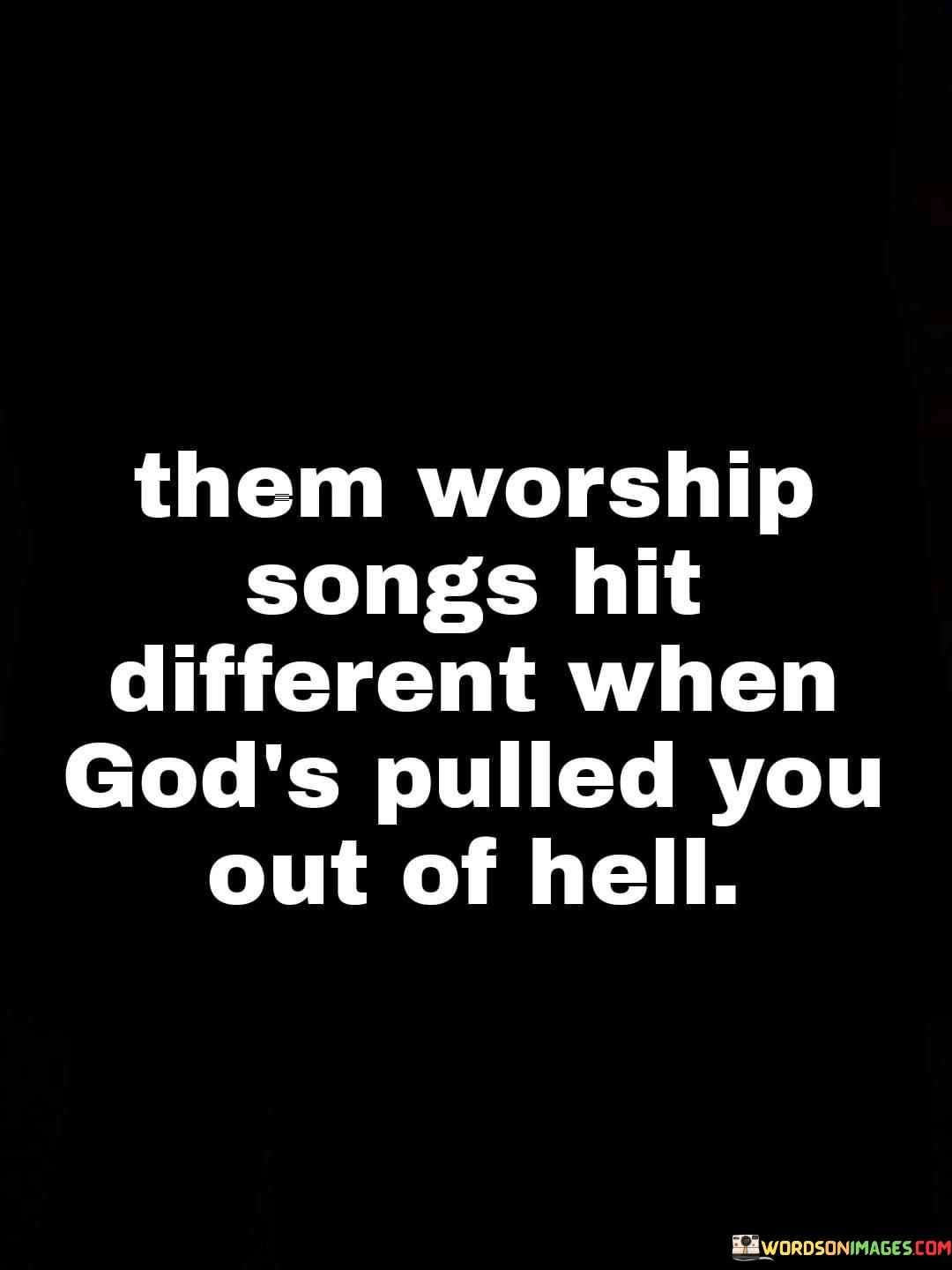 The quote "Them Worship Songs Hit Different When God's Pulled You Out of Hell" expresses the profound impact of faith and spirituality on a person's life, particularly when they have faced and overcome significant challenges or hardships. It suggests that the experience of coming through difficult times can deepen one's connection with God and make worship songs resonate on a deeper level.
