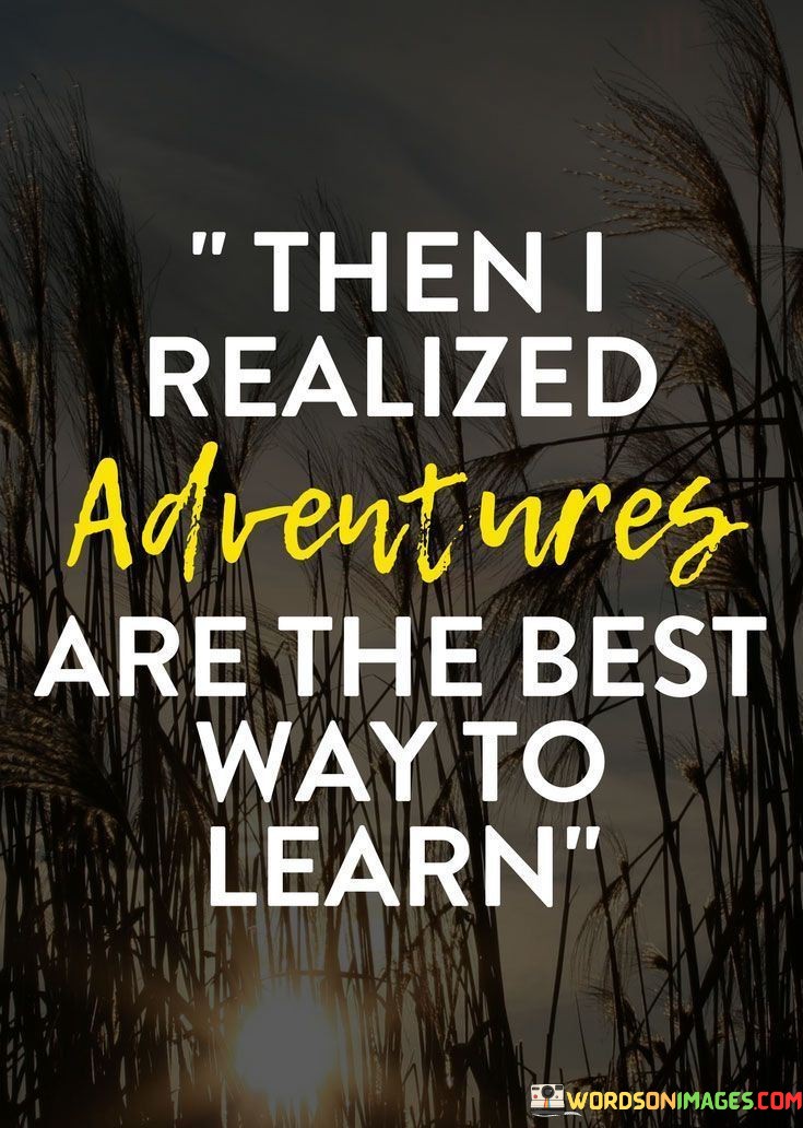 Epiphanies arrive through adventures. Exploration is a profound teacher. I understood that experiences are superior tutors. Ventures offer lessons beyond textbooks. Life's journeys grant wisdom. The world becomes the classroom. Adventures unfold stories and insights that classrooms can't match. Learning thrives in the realms of exploration.