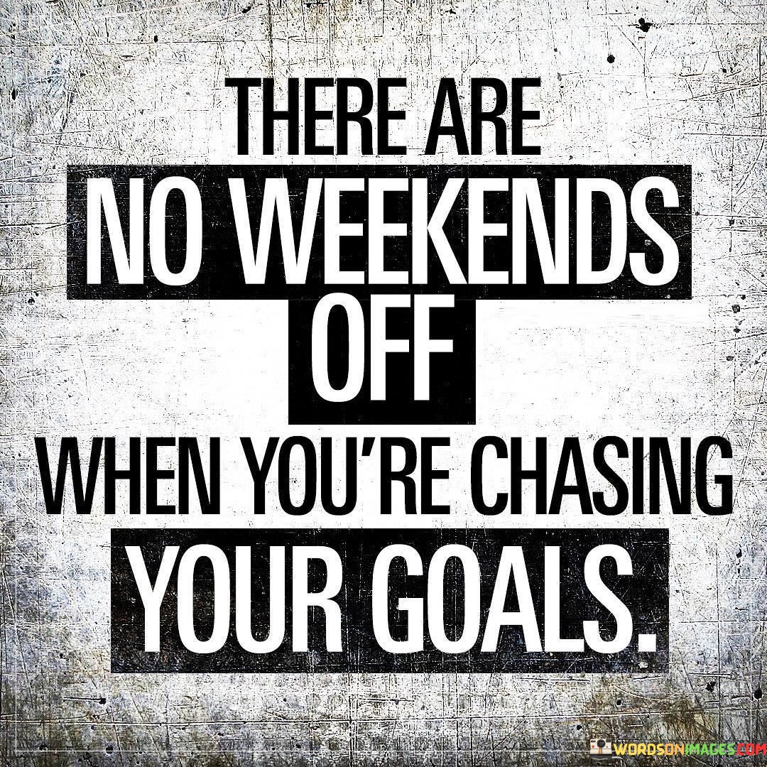 The quote emphasizes the dedication and commitment required to achieve one's goals. It suggests that pursuing aspirations demands continuous effort and dedication, with no breaks or weekends off.