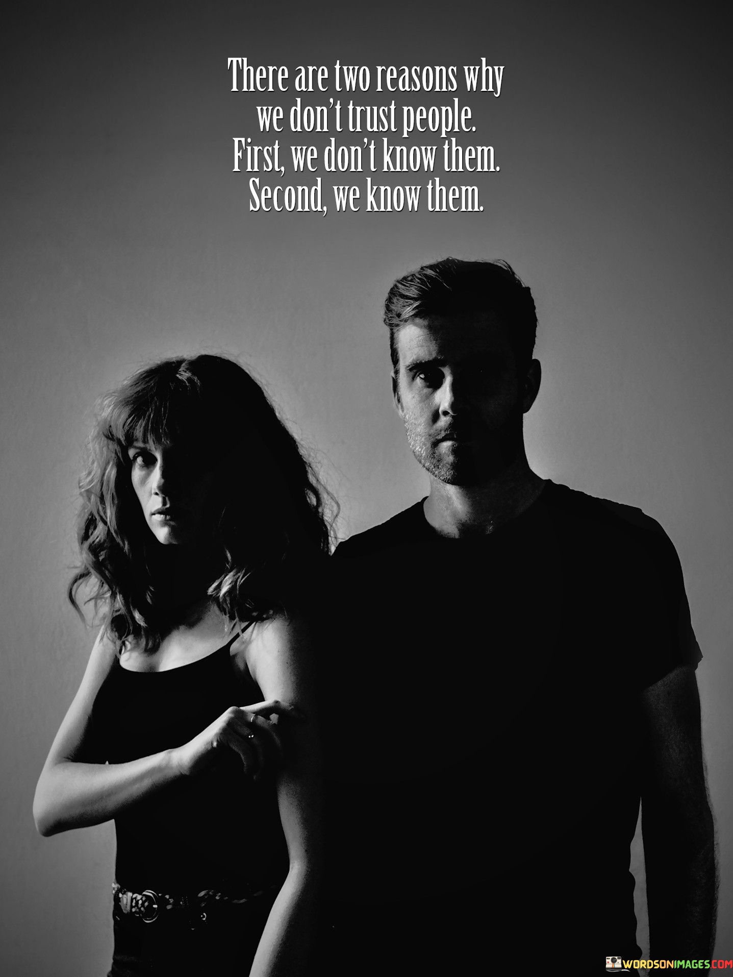 The quote delves into the complexities of trust. It suggests that lack of trust originates from two contrasting factors. Firstly, unfamiliarity breeds suspicion, as we're cautious about those we don't know well. Secondly, deeper knowledge may lead to mistrust, as we become aware of flaws. The quote highlights the intricacies of human relationships.
