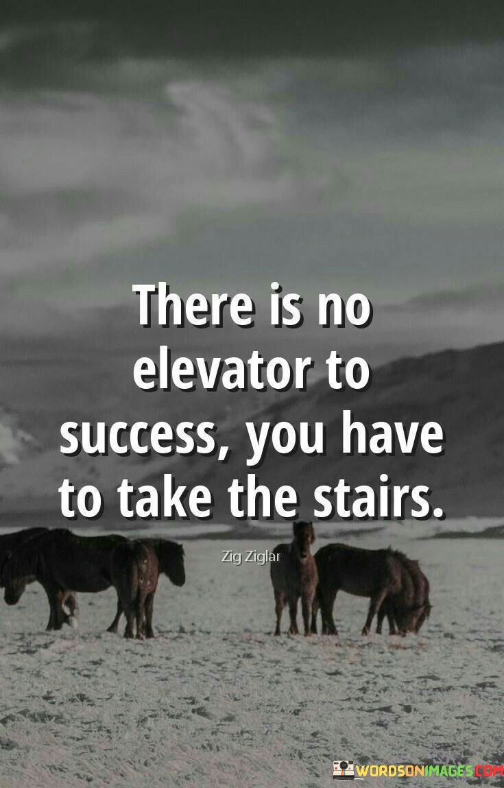 The metaphor of an elevator's absence symbolizes the reality that true success is earned through sustained commitment. Embracing the challenge of "taking the stairs" emphasizes the character-building nature of the journey toward achieving meaningful accomplishments.