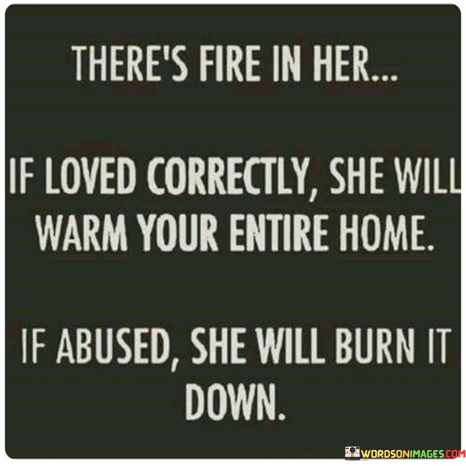 This quote vividly illustrates the transformative power of love and the potential consequences of mistreatment within a relationship. It suggests that the woman being described possesses a passionate and fiery nature. When loved correctly, with care, respect, and understanding, she has the ability to bring warmth, comfort, and harmony to a home. Her love becomes a source of nurturing and positive energy that radiates throughout the entire household, creating a sense of safety and contentment. However, the quote also warns of the destructive power that can arise if she is mistreated or abused. In such circumstances, her fiery nature can turn into a destructive force, capable of engulfing everything in its path. It serves as a cautionary reminder that love should be cherished and reciprocated with kindness and empathy. It highlights the importance of treating one another with care and recognizing the potential consequences of mistreatment within a relationship. The quote emphasizes the need for mutual respect, understanding, and the responsible handling of emotions in order to maintain a healthy and harmonious connection. It reminds us that love can be both a powerful force for healing and a potential catalyst for destruction, depending on how it is nurtured and reciprocated.