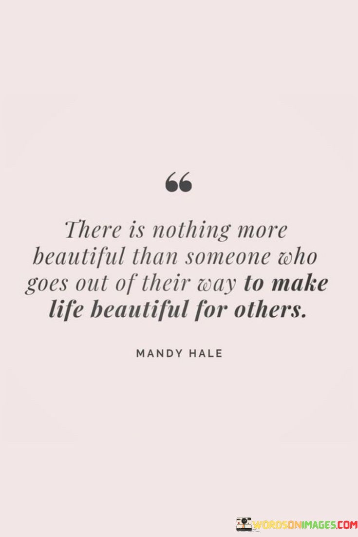 The quote magnifies the significance of empathy. It implies that beauty lies in enriching others' lives. It underscores the power of gestures that uplift and inspire. By highlighting the radiant beauty of those who selflessly contribute to others' well-being, the quote encourages cultivating a spirit of generosity and compassion, enhancing the beauty of the world.