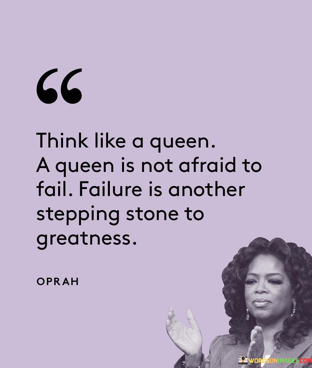 The quote "Think like a queen; a queen is not afraid to fail. Failure is another stepping stone to greatness" encourages individuals to adopt a mindset of confidence, resilience, and embracing failure as a catalyst for growth and success. It suggests that emulating the mindset of a queen, who possesses inner strength and regal qualities, involves approaching challenges with fearlessness and a willingness to take risks. The quote acknowledges that failure is an inevitable part of the journey toward achieving greatness. It implies that rather than being deterred by failure, individuals should view it as a valuable opportunity for learning, self-improvement, and personal development. Failure is seen as a stepping stone, a necessary part of the path to greatness, as it provides valuable lessons, insights, and the motivation to persist and improve. By thinking like a queen, individuals can cultivate a mindset of resilience, perseverance, and a willingness to embrace failure as a necessary part of the process. It encourages individuals to let go of the fear of failure and instead view it as a natural part of the journey toward success. This quote serves as a reminder that failure is not an endpoint but rather a stepping stone that propels individuals closer to their goals. It empowers individuals to learn from their mistakes, adapt their strategies, and continue pursuing their dreams with determination and self-belief. By thinking like a queen, individuals can reframe their perception of failure, recognizing it as an opportunity for growth and a necessary component of their journey toward achieving greatness.