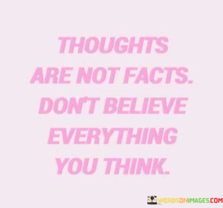 The quote, "Thoughts are not facts; don't believe everything you think," imparts a valuable lesson about the nature of our thoughts and the importance of critical thinking and discernment. It reminds us that our minds constantly generate thoughts, but not all of these thoughts are accurate reflections of reality. The quote encourages us to question and challenge our thoughts, recognizing that they are often influenced by biases, emotions, and past experiences. By cultivating a sense of awareness and detachment from our thoughts, we can avoid falling into the trap of believing everything our minds produce. Instead, we learn to assess the validity and truthfulness of our thoughts, separating fact from fiction and making informed decisions based on evidence and reason. This quote serves as a reminder to engage in critical self-reflection and to approach our thoughts with a healthy dose of skepticism, empowering us to navigate life with greater clarity, objectivity, and a deeper understanding of ourselves and the world around us. At its core, the quote celebrates the capacity of the human mind to generate a multitude of thoughts on a constant basis. It acknowledges that thoughts arise spontaneously and are influenced by various internal and external factors, including our emotions, beliefs, and past experiences. While thoughts can be powerful and influential, they do not necessarily represent objective truths or facts about the world. Moreover, the quote speaks to the concept of cognitive flexibility and open-mindedness. By recognizing that thoughts are not facts, we embrace a more flexible and adaptive mindset, allowing us to entertain different perspectives and consider alternative explanations or interpretations of a situation Furthermore, the quote underscores the importance of self-awareness and mindfulness. By being conscious of our thoughts and emotions, we can observe them without immediately accepting them as truth. This mindfulness allows us to break free from automatic thought patterns and challenge any cognitive biases that might cloud our judgment. In conclusion, the quote "Thoughts are not facts; don't believe everything you think" reminds us of the dynamic and subjective nature of our thoughts. By approaching our thoughts with a critical and discerning mindset, we can avoid being misled by biases and emotions, and instead make decisions based on evidence, reason, and objectivity. This quote serves as a valuable reminder to engage in self-reflection, question our assumptions, and cultivate a more open and flexible perspective. By developing a healthy skepticism towards our thoughts and embracing mindfulness, we empower ourselves to navigate life with greater clarity, wisdom, and a deeper understanding of ourselves and the world around us.