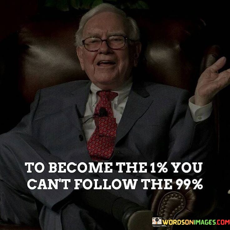 The quote "To become the 1%, you can't follow the 99%" underscores the idea that achieving exceptional success and standing out from the crowd requires a mindset and approach that deviates from the norm. It suggests that those who aspire to be part of the top echelon of achievers must be willing to break away from the majority and adopt a different path, mindset, and work ethic. In a world where conformity and following the crowd are prevalent, this quote serves as a reminder that greatness often lies in being unconventional and daring to take risks. The 1% represents those who have achieved extraordinary levels of success, and to join their ranks, individuals must be prepared to embrace their uniqueness and pursue their aspirations with unwavering determination. Furthermore, the quote challenges the concept of mediocrity and average expectations. It emphasizes that reaching the pinnacle of success requires setting ambitious goals, going beyond the status quo, and pushing the boundaries of what is deemed achievable. Those who aim to be part of the 1% must strive for excellence, continuously improve their skills, and make sacrifices to stand out from the crowd. Moreover, the quote emphasizes the importance of self-belief and self-reliance. To be part of the 1%, individuals must trust in their abilities, chart their own course, and not be swayed by the opinions or limitations imposed by others. Self-confidence and resilience are vital traits that enable individuals to overcome challenges and setbacks on the path to success.