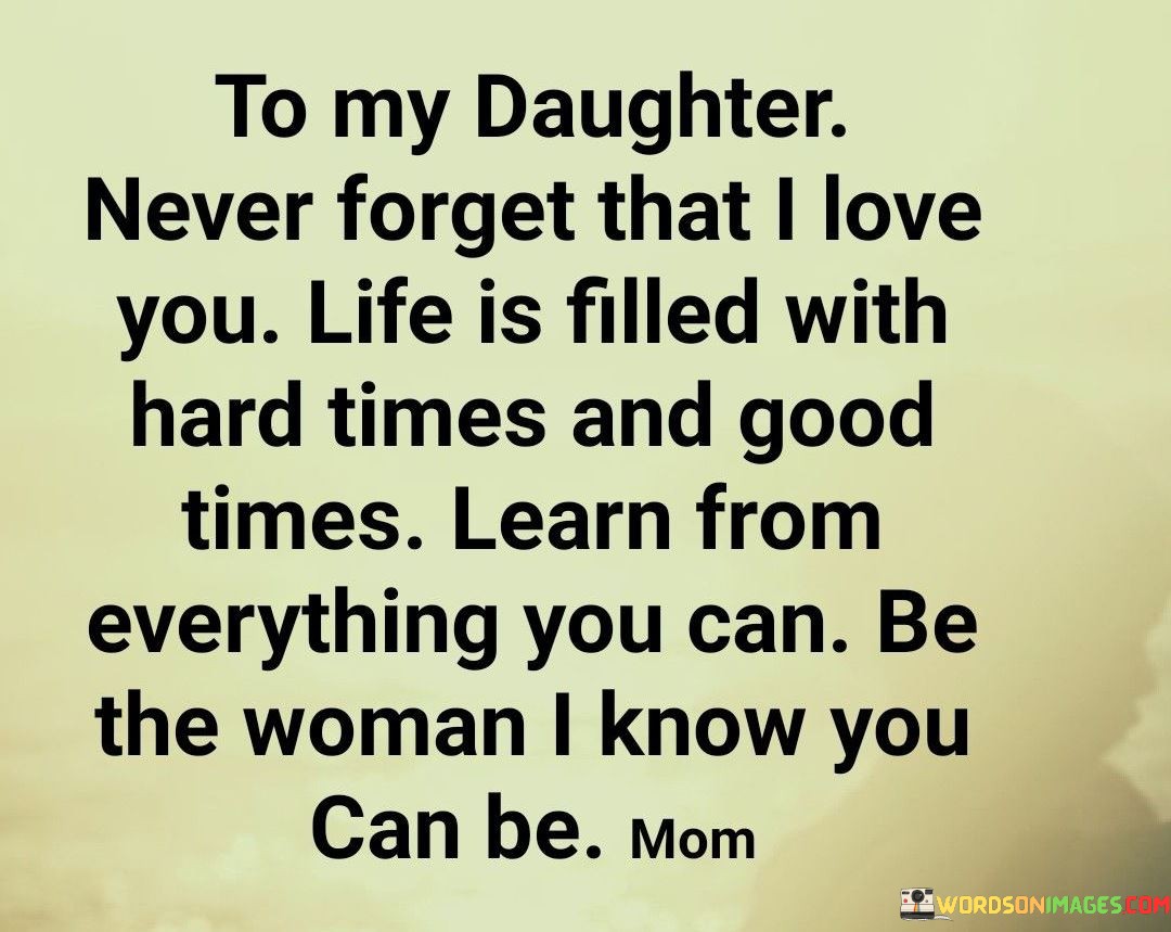 The quote "To my daughter, never forget that I love you. Life is filled with hard times and good times. Learn from everything, and be the woman I know you can be" encapsulates a profound message from a parent to their daughter, encompassing love, resilience, personal growth, and empowerment. It serves as a heartfelt reminder of the unwavering and unconditional love the parent has for their daughter, assuring her that this love will always be a constant presence in her life.