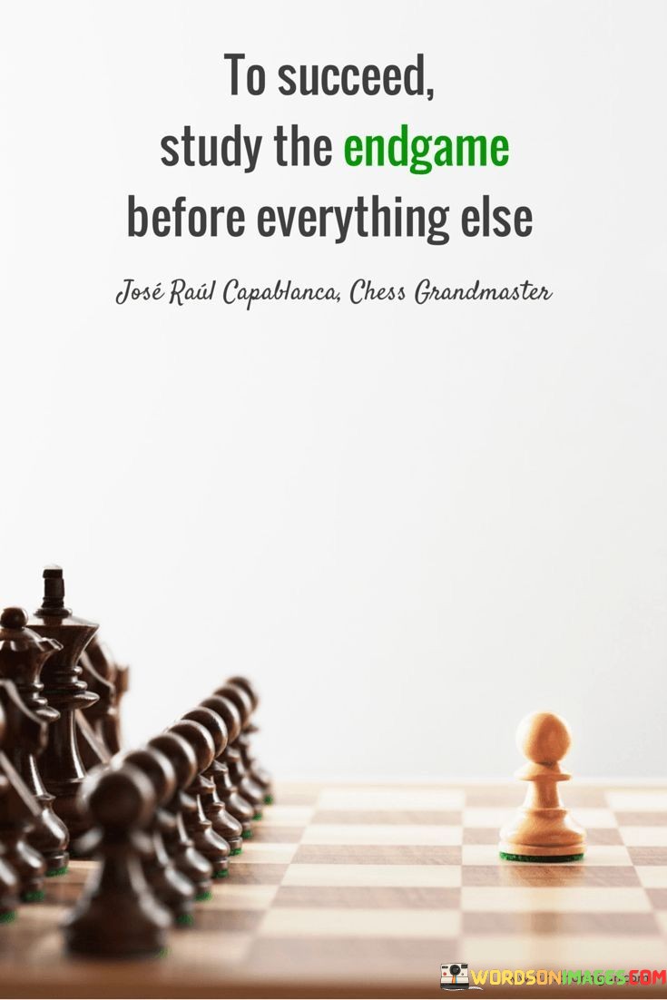 "To Succeed, Study the Endgame Before Everything Else." This advice suggests that in order to achieve success, it's important to have a clear understanding of the desired outcome or end goal right from the beginning. By focusing on the ultimate objective, individuals can make informed decisions and strategic choices.