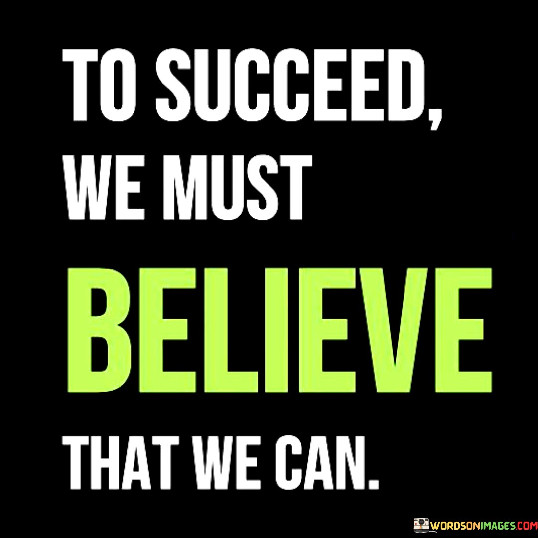 The quote "To succeed, we must believe that we can" underscores the significance of self-belief in achieving success. It suggests that having confidence in one's abilities and potential is a foundational element for accomplishing goals.