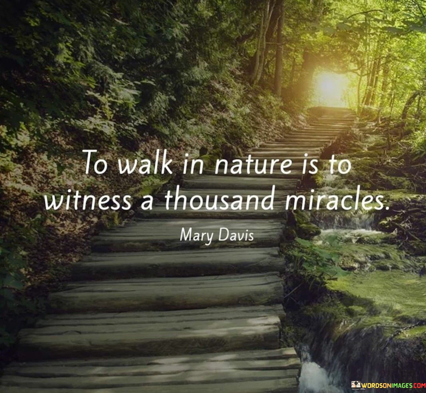 The quote celebrates the breathtaking beauty of the natural world. It's a reminder to pause, appreciate, and marvel at the simple yet extraordinary moments that nature presents. Walking amidst these miracles soothes the soul, connecting us to a world beyond screens and stress. In every forest, every meadow, nature paints its masterpiece, and we are fortunate witnesses.
