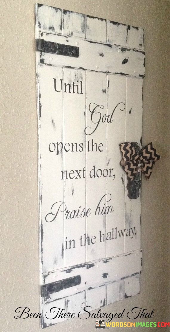 The quote "Until God opens the next door, praise Him in the hallway" is a powerful reminder to maintain faith and gratitude even in times of waiting or uncertainty. It suggests that when we find ourselves in a transitional phase of life, metaphorically represented as the "hallway," we should continue to express thanks and reverence to a higher power, regardless of our current circumstances.