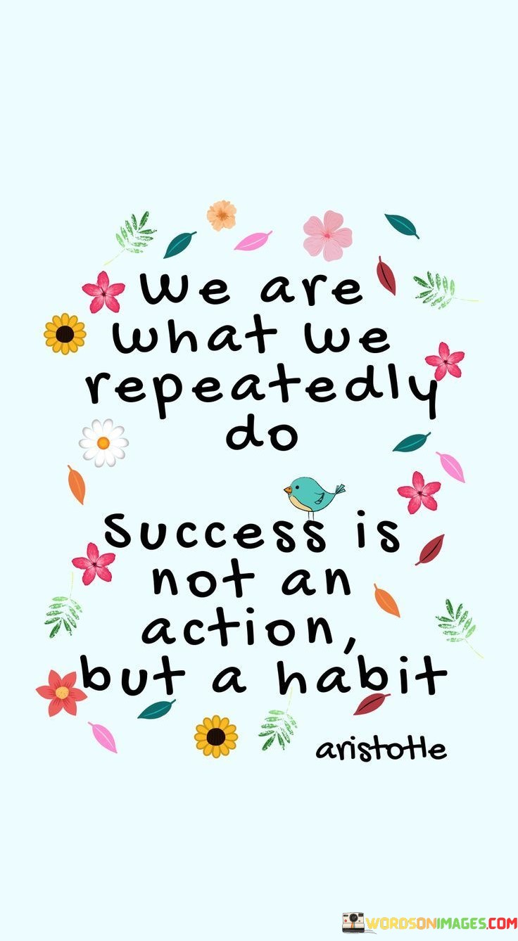 "We Are What We Repeatedly Do. Success Is Not an Action, But a Habit." This statement emphasizes that our consistent behaviors and habits shape our identity and define our achievements. It suggests that success is not a singular event but a result of ongoing positive habits.