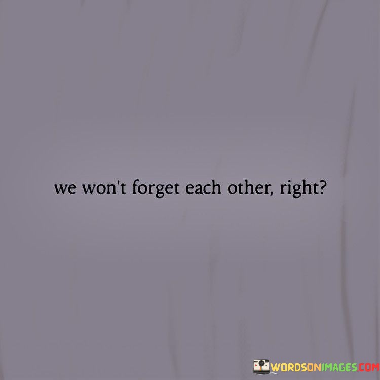 The quote "We won't forget each other, right?" is a poignant expression of the fear or uncertainty that can arise in relationships, especially when facing separation or change. It captures the human desire for lasting connections and the hope that the bonds formed with others will endure over time.