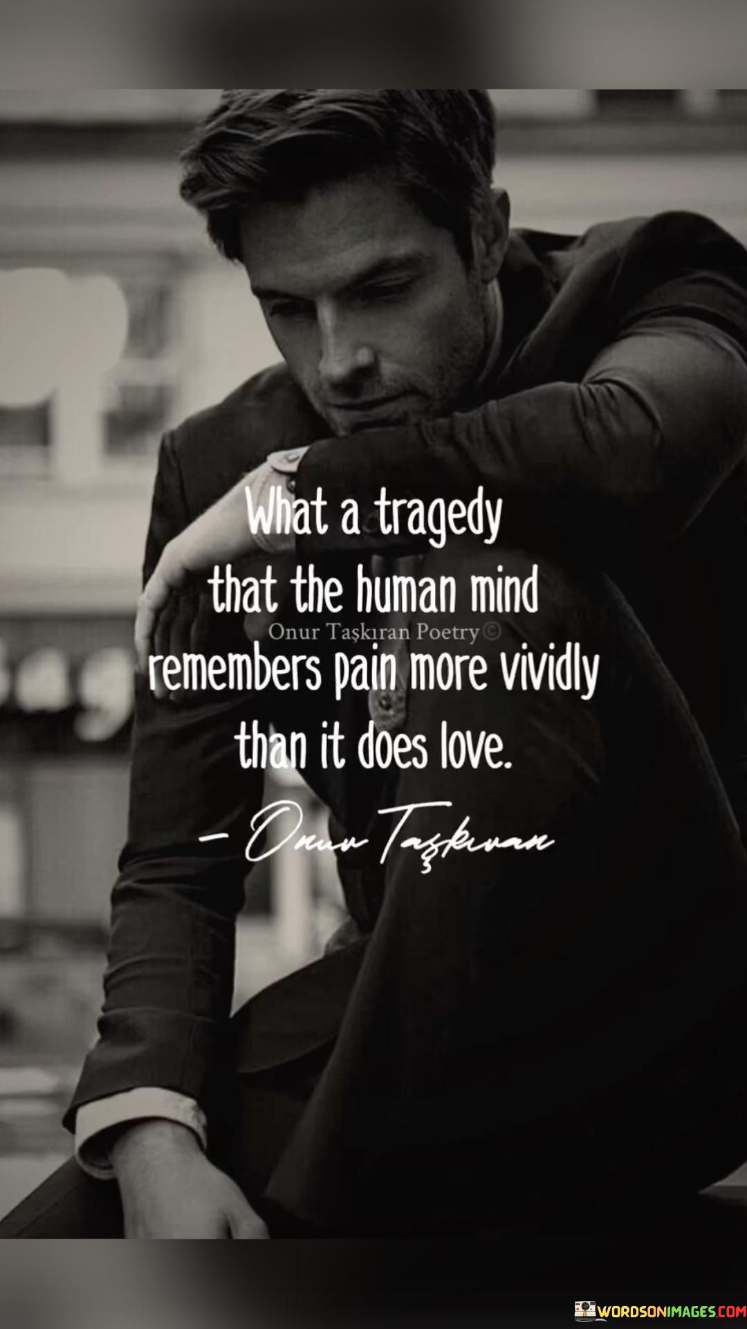 The quote contrasts memory of pain and love. "Human mind remembers pain" reflects its lasting impact. "More vividly than love" underscores the intensity of pain's imprint. The quote conveys the unfortunate tendency for pain to linger more prominently than positive emotions.