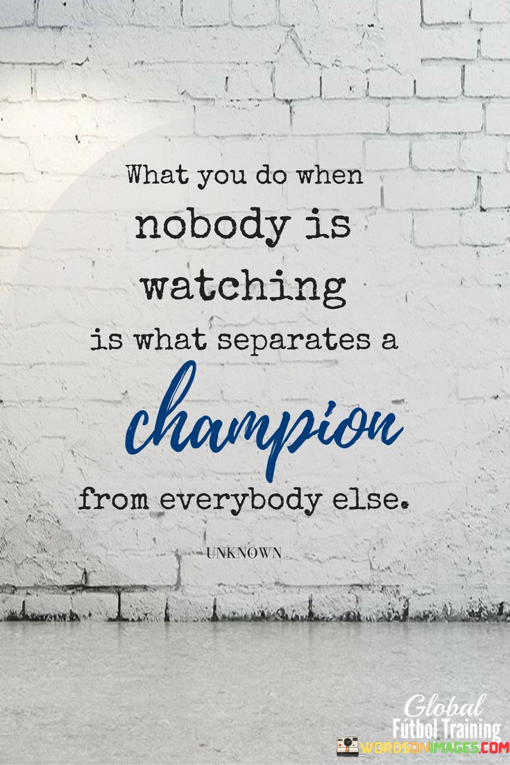 "What You Do When Nobody Is Watching Is What Separates a Champion from Everybody Else": This quote highlights the essence of character and dedication in achieving greatness. It suggests that one's actions and choices when not under scrutiny define their commitment and set them apart from the norm.