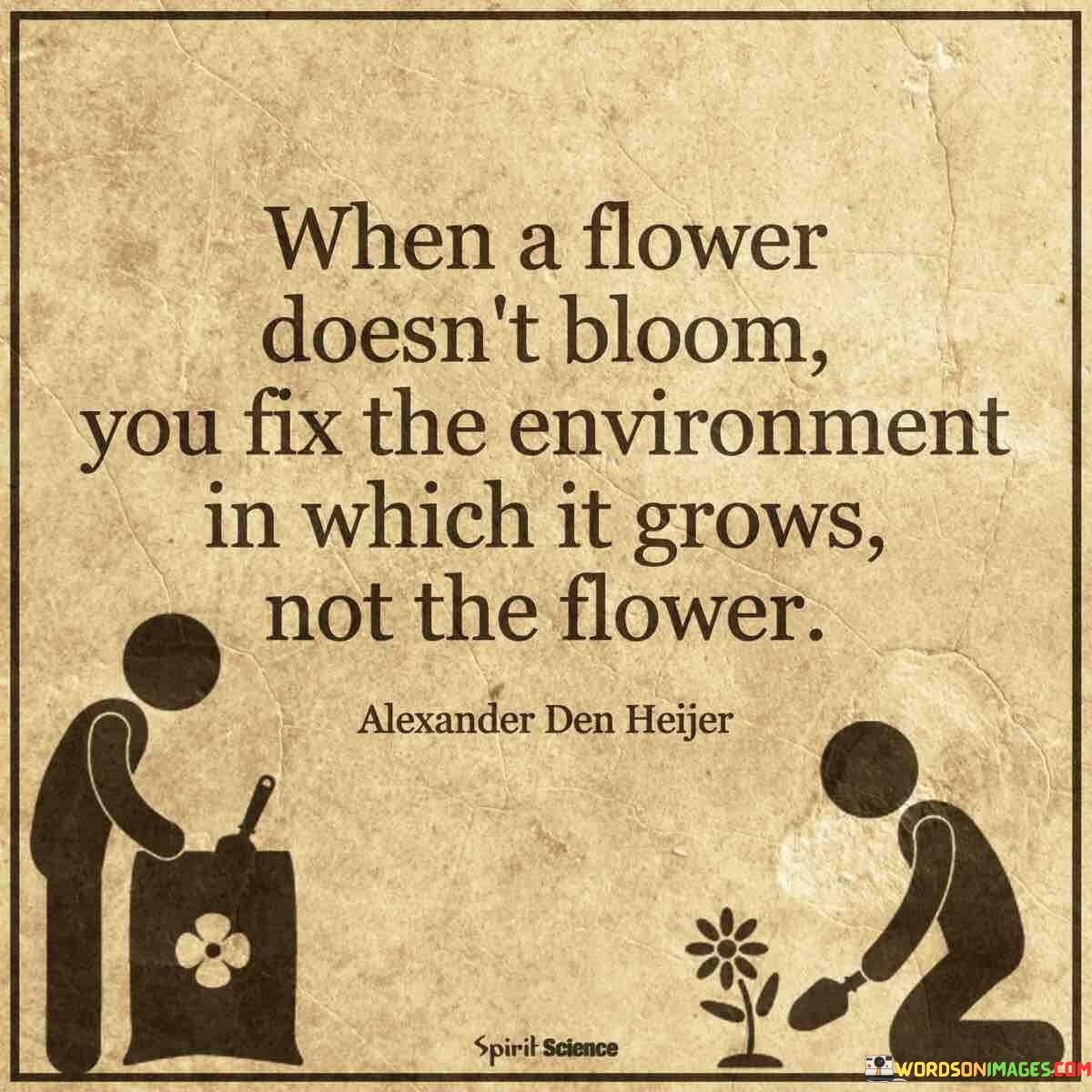 The quote "When a flower doesn't bloom, you fix the environment in which it grows, not the flower" draws a parallel between personal development and nurturing conditions. It suggests that addressing external factors can promote growth, rather than trying to change inherent qualities. This perspective emphasizes the importance of creating a supportive and conducive environment.