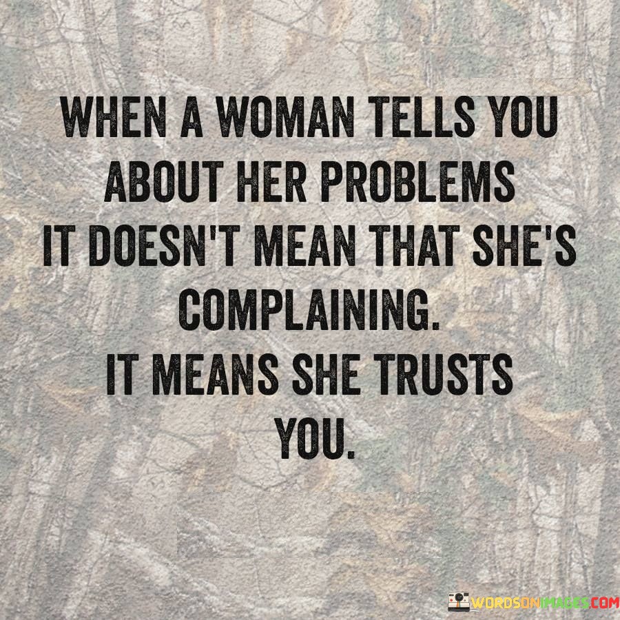 Moreover, the quote underscores the significance of trust in interpersonal relationships. It suggests that when a woman chooses to confide in someone about her problems, it is an indication that she believes in the listener's capacity to provide a safe space for emotional expression. This act of trust deepens the connection between the individuals, as it implies that the woman feels comfortable and secure in sharing her challenges and seeking support.this quote highlights the importance of trust and empathy in interpersonal relationships, particularly when women share their challenges. It challenges the notion of complaints and reframes them as acts of trust and vulnerability. By recognizing the significance of a woman's openness about her problems, we can respond with empathy and understanding, fostering deeper connections and strengthening the bond of trust within the relationship.