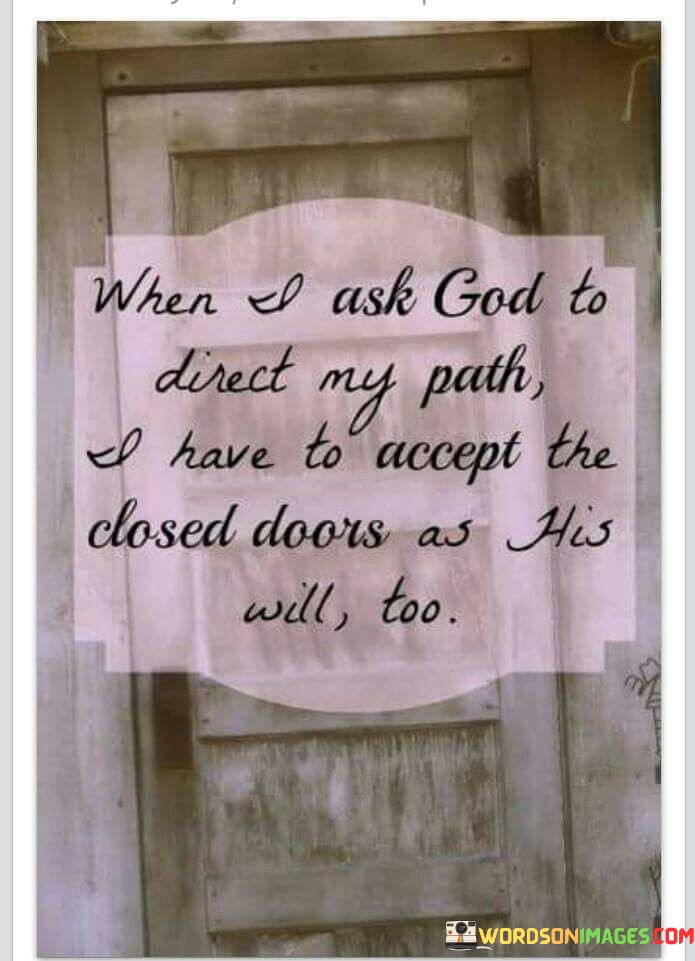 The quote "When I ask God to direct my path, I have to accept the closed doors as His will too" highlights the concept of surrendering to God's plan and trusting His guidance even when things don't go as expected. It implies that when individuals seek God's direction in their lives, they should be prepared to accept not only the open doors and opportunities but also the closed doors and setbacks as part of God's divine plan.
