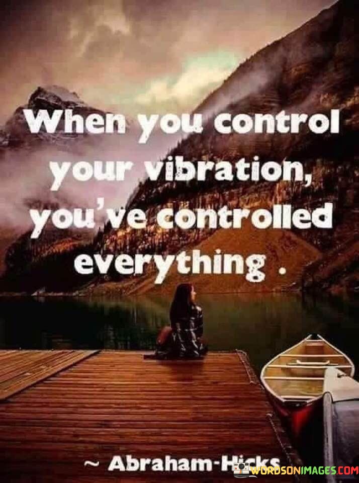 This quote reflects the idea that one's emotional and energetic state, often referred to as "vibration," has a profound influence on their experiences and outcomes in life. It suggests that by managing and elevating one's emotions, they can gain a sense of mastery over various aspects of their existence.